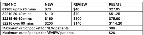 Cost: Range between $0 -$86 out of pocket with a valid Medicare Card. Costs vary depending on length of consultation